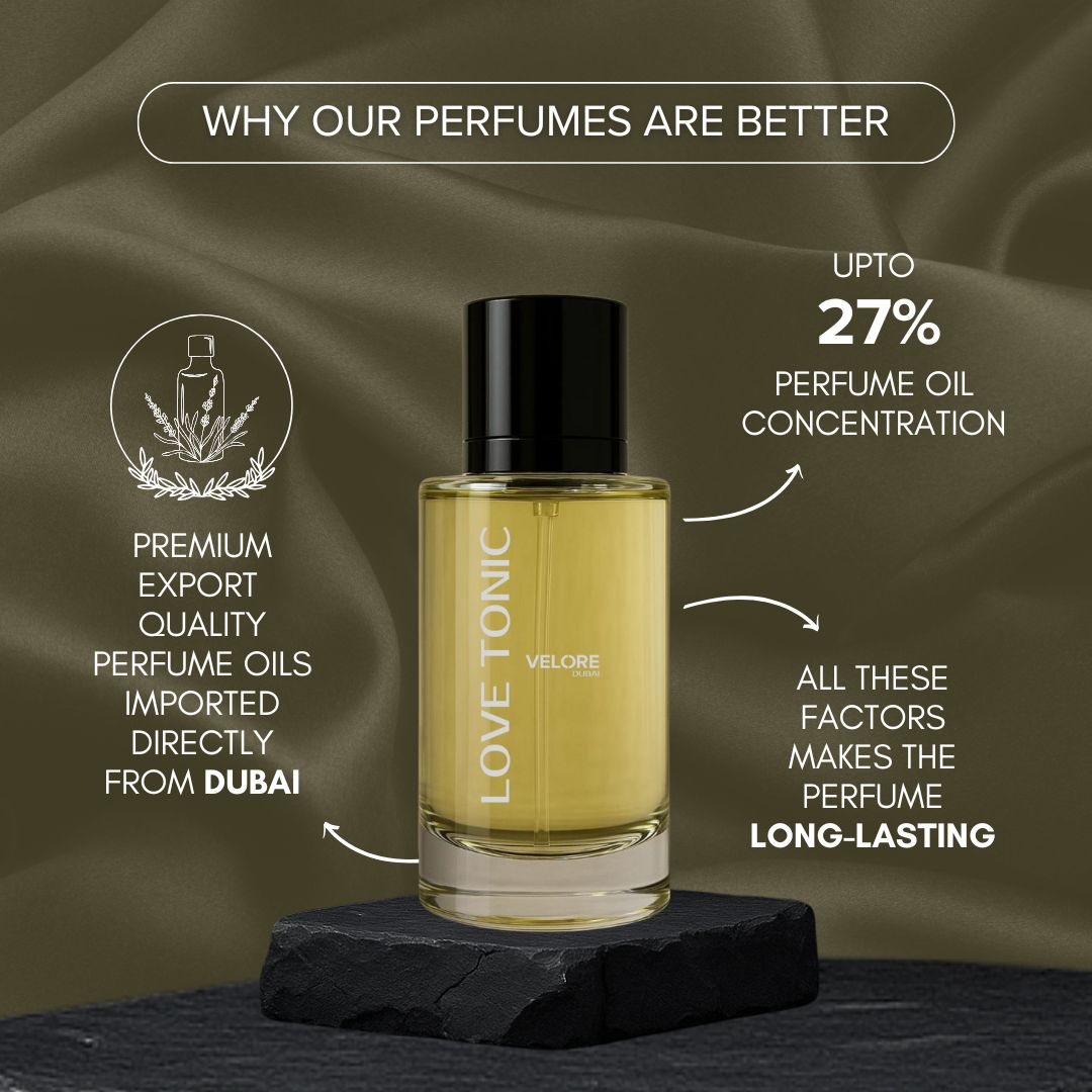 We at Velore perfumes we use a high-concentration Extract de Parfum (ExDP) formula, ensuring strong projection and long-lasting performance. The perfume oils are imported from Dubai and are designed to suit warmer climates, lasting longer on the skin than standard EDPs.