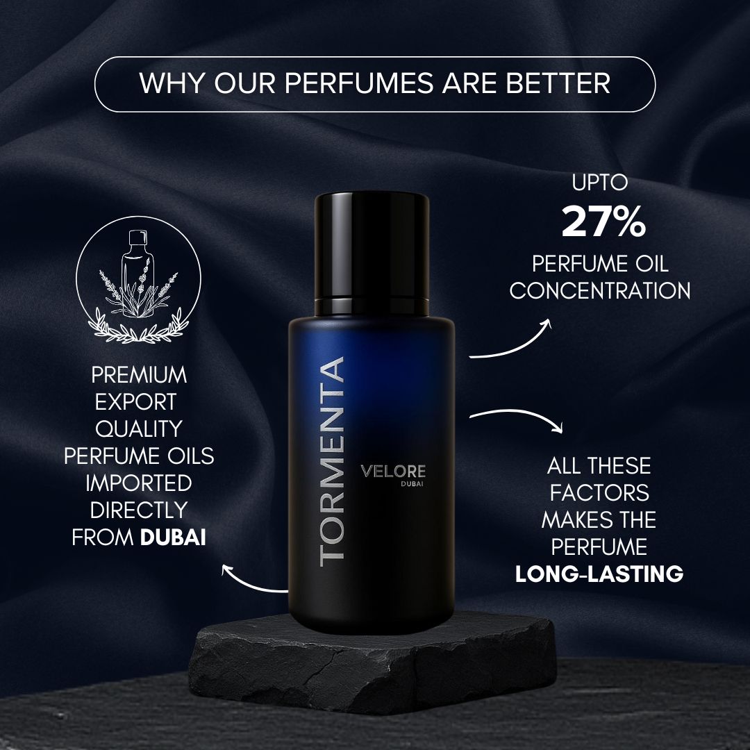 We at Velore perfumes we use a high-concentration Extract de Parfum (ExDP) formula, ensuring strong projection and long-lasting performance. The perfume oils are imported from Dubai and are designed to suit warmer climates, lasting longer on the skin than standard EDPs.