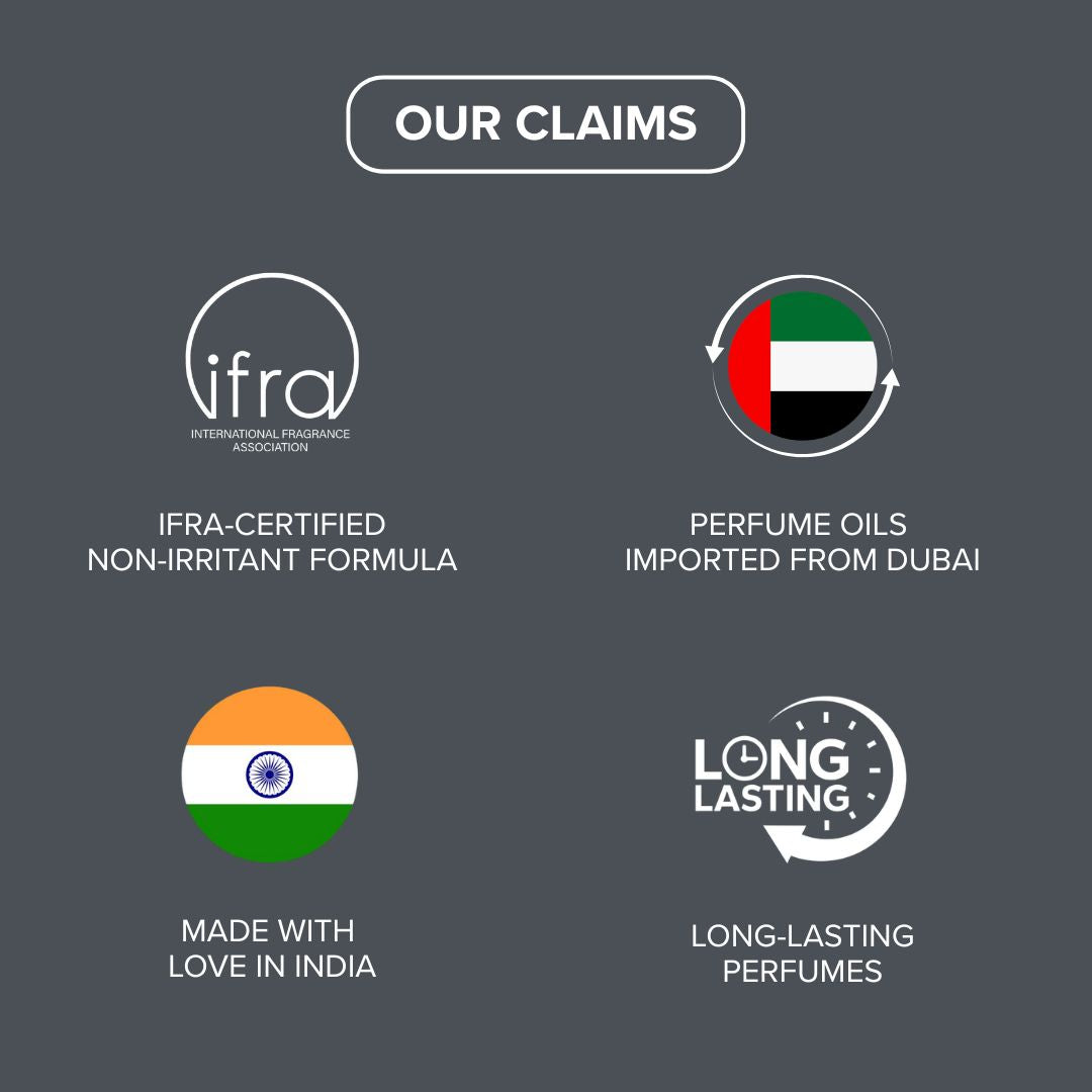 Longevity can vary depending on the fragrance, fresher scents typically last around 8 to 10 hours, while oriental and woody perfumes like Zed Black and Love Tonic can last up to 24+ hours. We use high-quality oils specially formulated to perform well in hot climates.