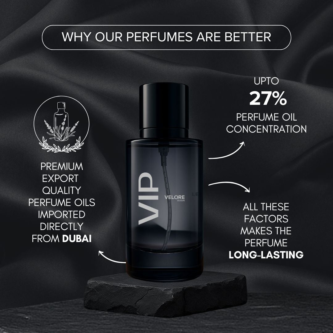 We at Velore perfumes we use a high-concentration Extract de Parfum (ExDP) formula, ensuring strong projection and long-lasting performance. The perfume oils are imported from Dubai and are designed to suit warmer climates, lasting longer on the skin than standard EDPs.